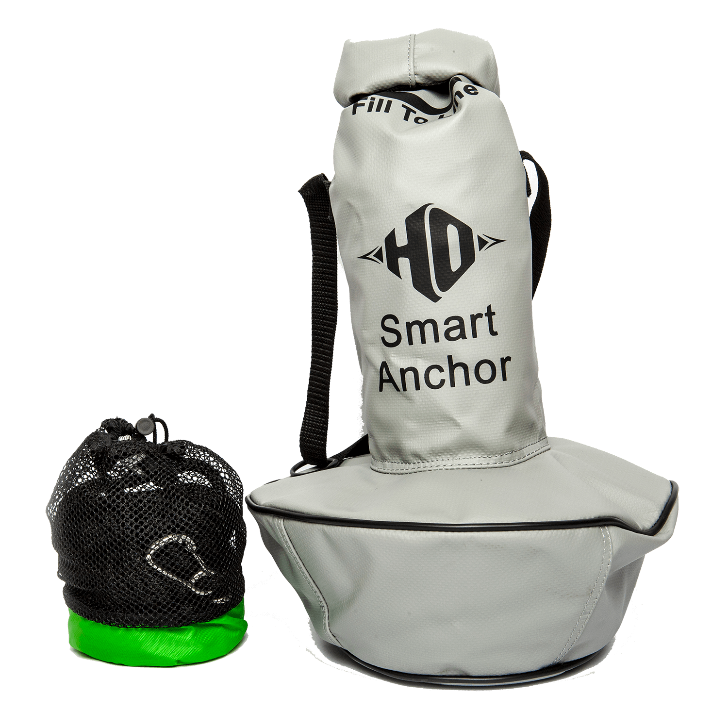 The HO Smart Anchor is a mushroom shape bag anchor. Fill it with rocks or sand and anchor large towables, iLANDs or iSUPs in up to 30 feet of water. Use the smart anchor to give your towables another life as floating islands. The Smart anchor includes the reinforced anchor bag, variable length 30 foot anchor line, and attached floating rope collection bag to keep the excess rope safely out of the way.